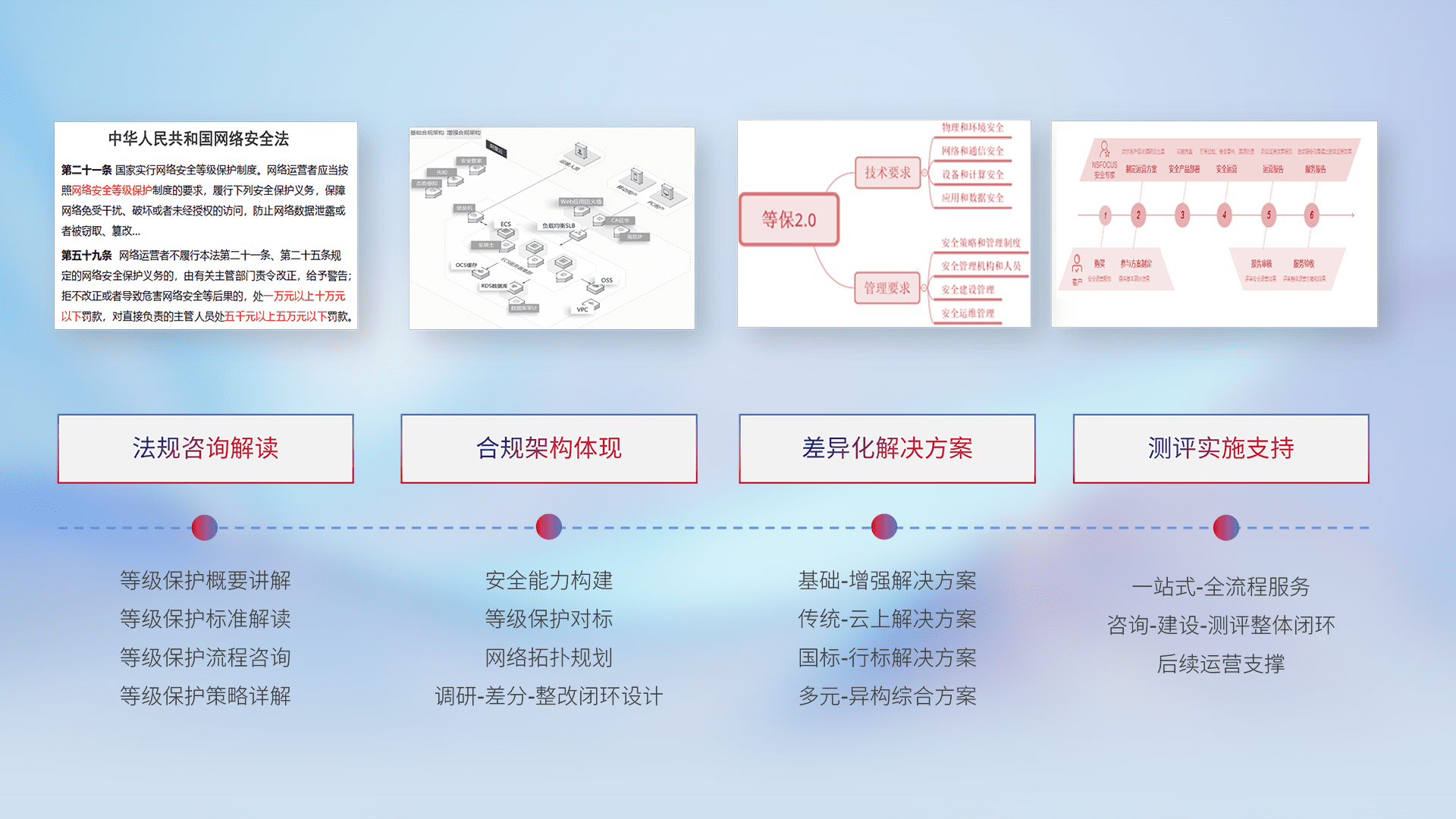 通过专业的法律咨询解读、、合规架构体现、、差异化解决方案、、测试实施支持等服务,,为客户量身打造等保合规体系。。。